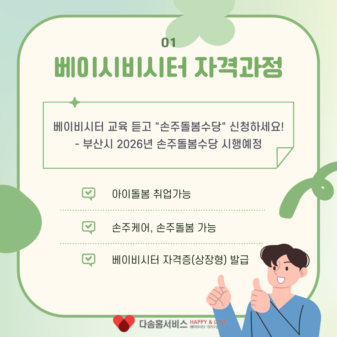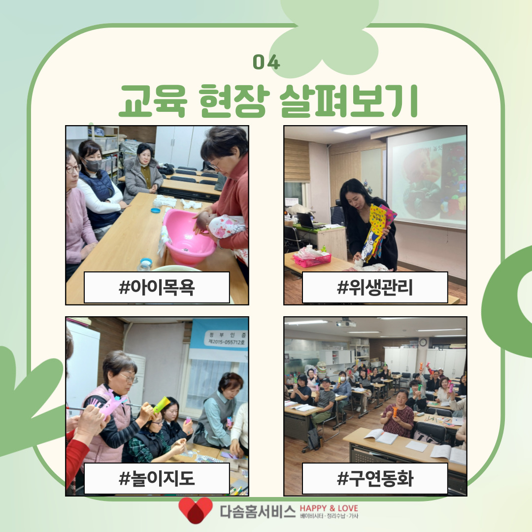 다솜홈서비스는 베이비시터, 가사전문가, 정리수납 전문가 취업을 연계한 교육프로그램을 운영하고 있습니다.